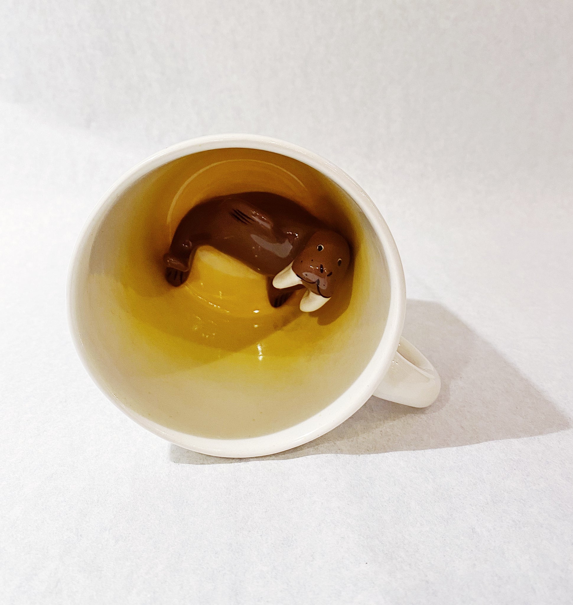 This adorable mug is perfect for the kitchen. Featuring a beige cup with a surprise animal inside. Sip and see a little lion, walrus or cat poking out from your beverage.